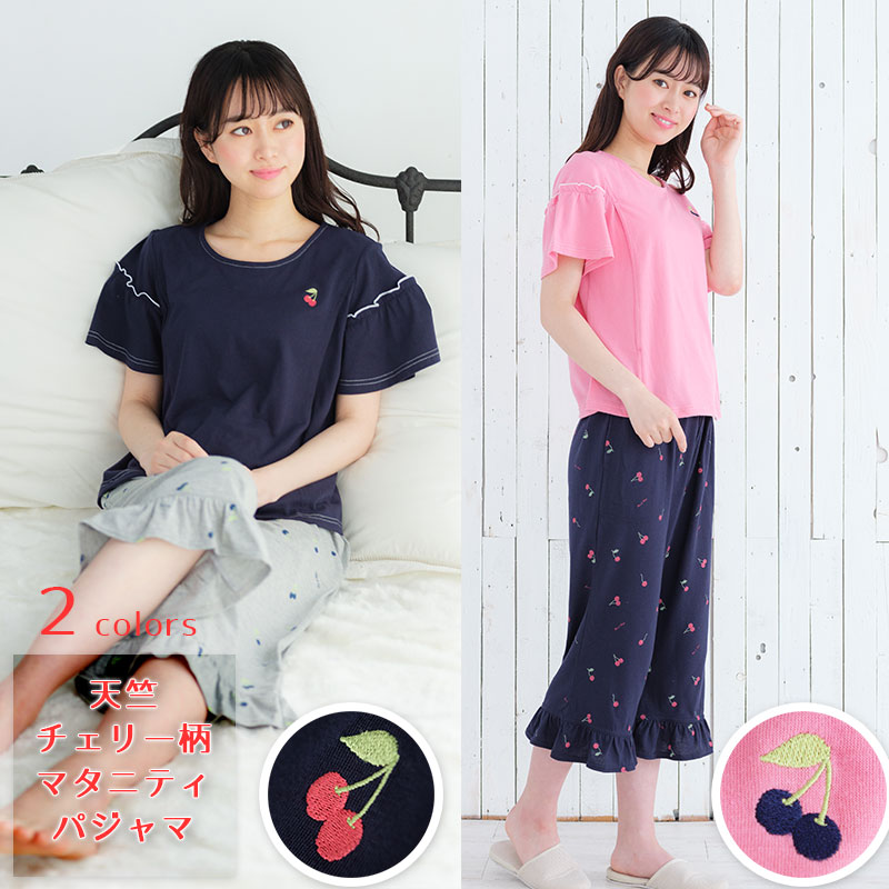 【送料無料】【マタニティ パジャマ】/夏・春夏/天竺 可愛いチェリー柄 マタニティ パジャマ / 授乳口/ピンク・紺/授乳口付き 半袖/春夏〜夏 おしゃれ/部屋着/産院への入院用